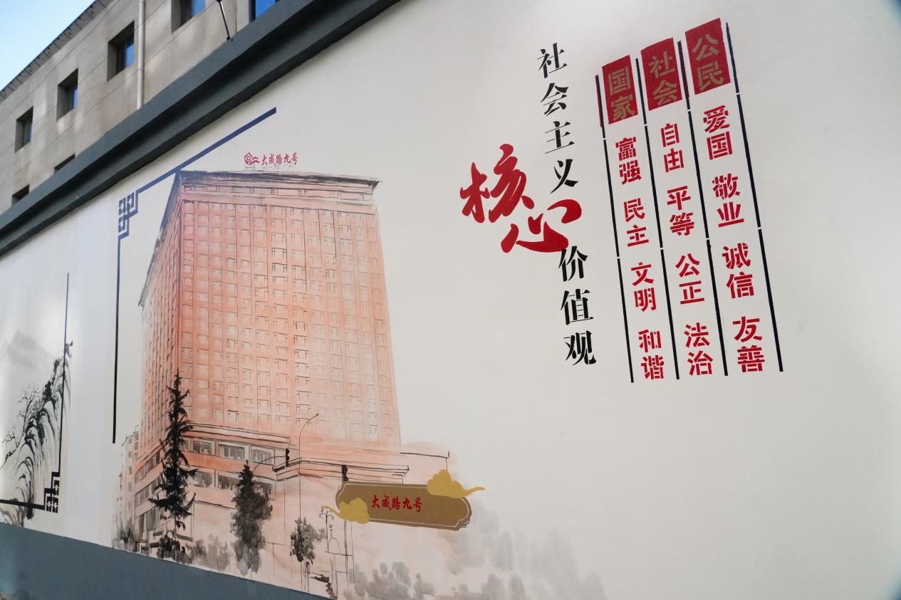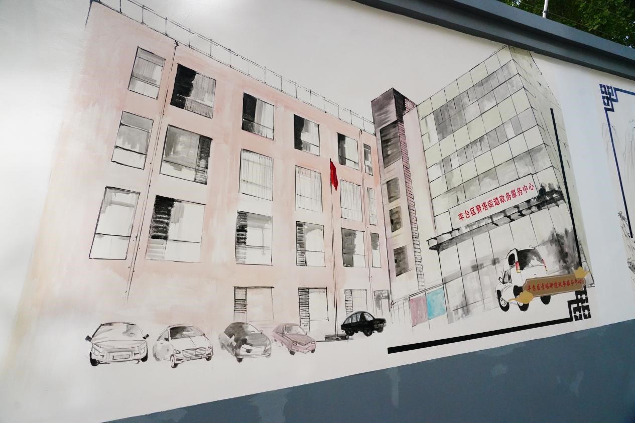 大成路九号、金隅大成时代、天利大厦、北京十一学校中堂实验学校、青塔街道办事处、青塔街心广场、红星美凯龙全球家居博览中心、翠微百货大成路店、郑常庄公园……创作团队带领志愿者与社会工作者以宋式美学为笔,用淡雅的色调与留白技法,将这些承载着居民共同记忆的场景,与历史古迹和谐地共绘于一墙之上。繁忙的现代生活与沉淀的历史文化在此刻交织,一幅完整、生动、充满温度的“青塔生活长卷”正在徐徐展开。